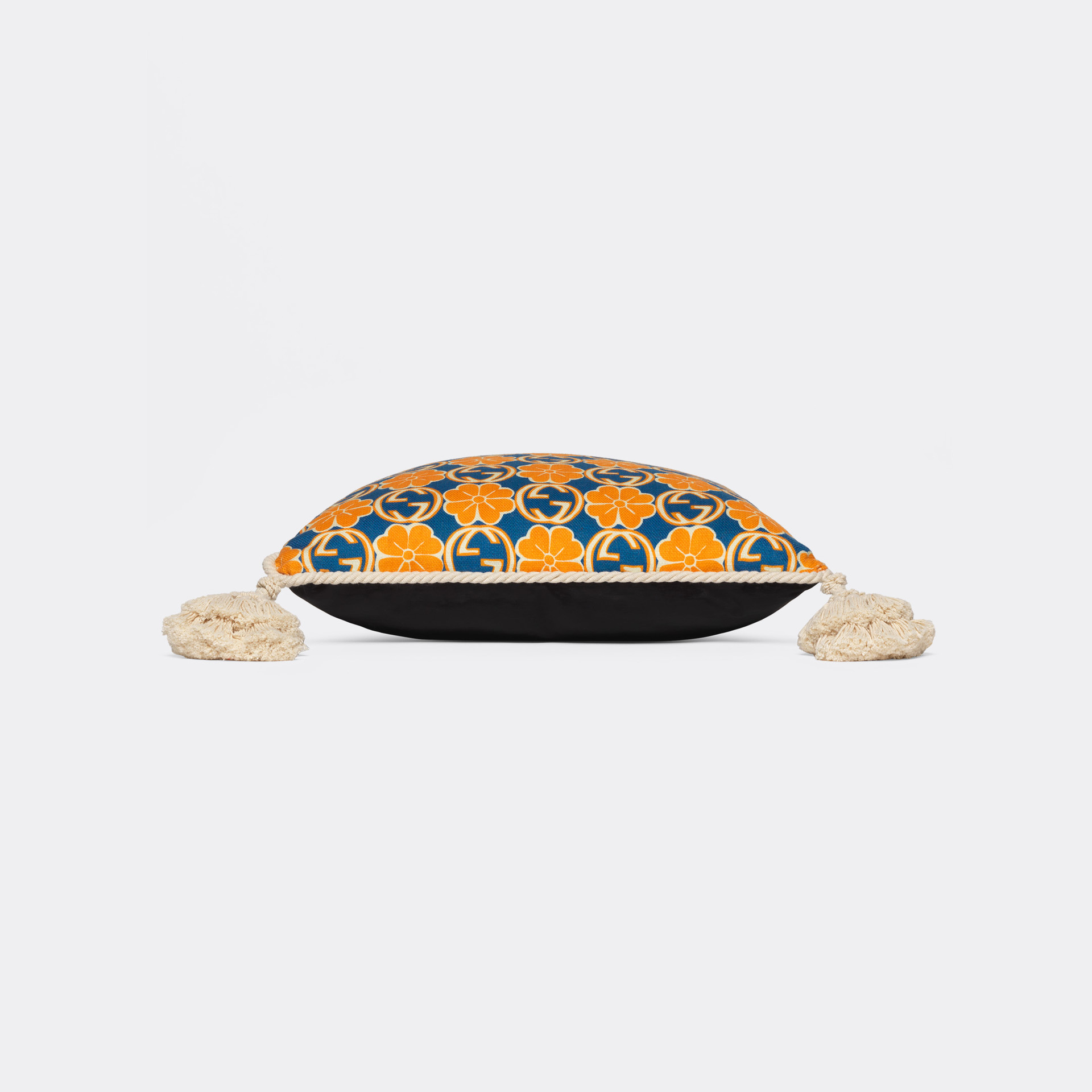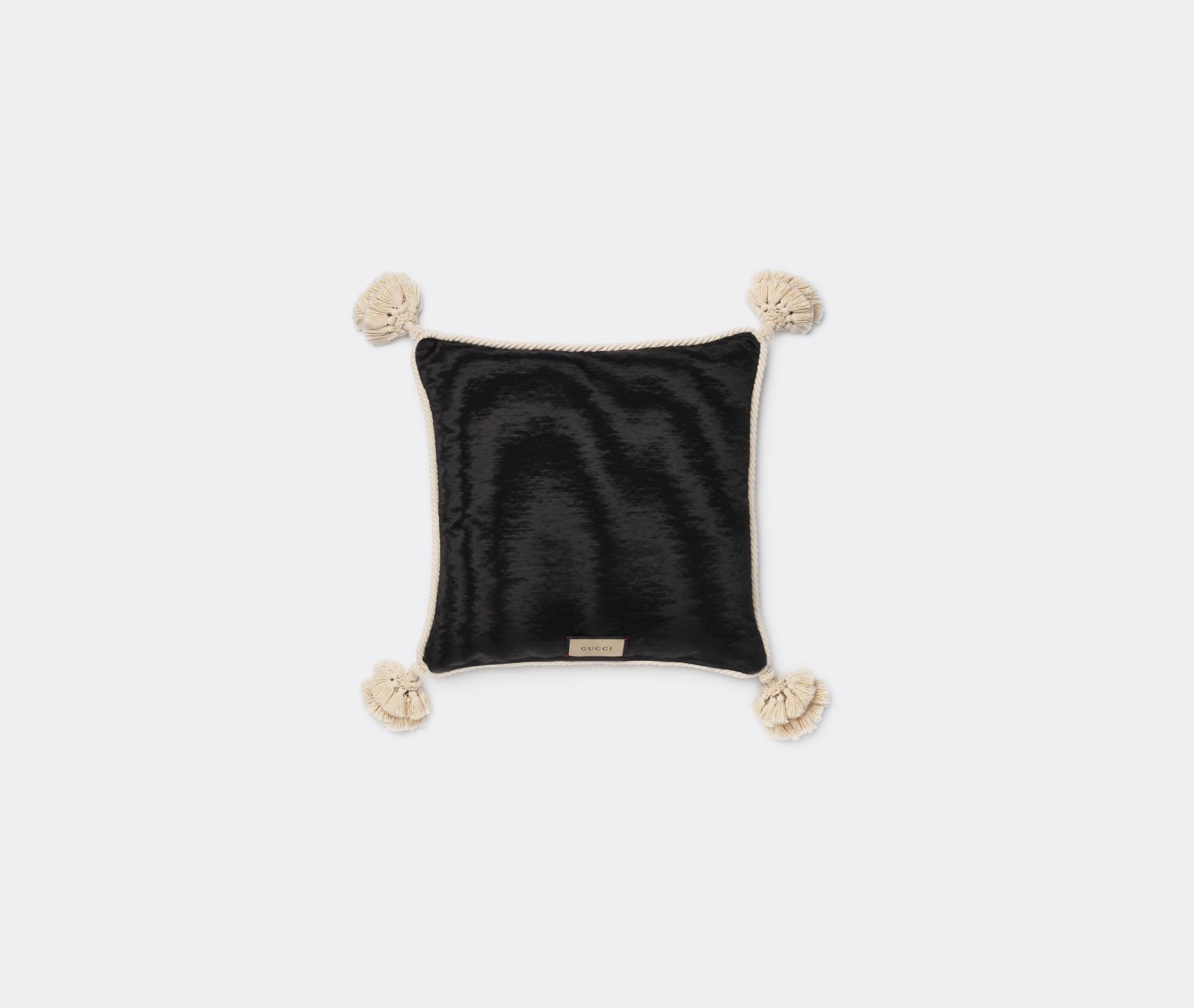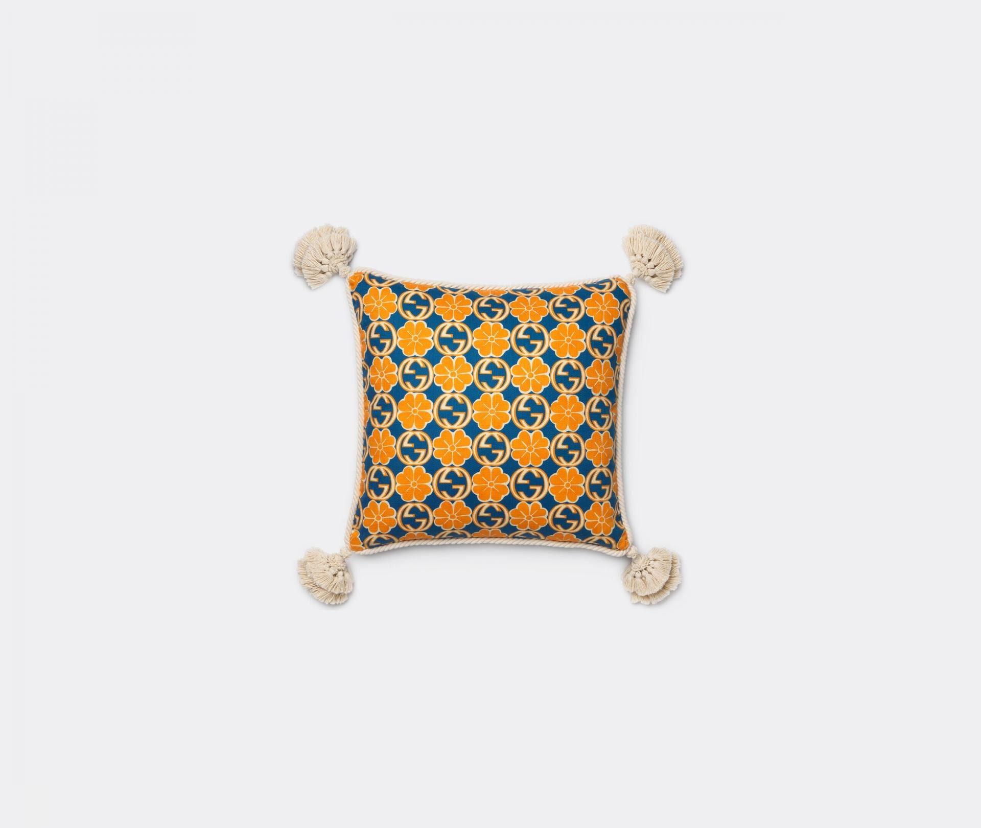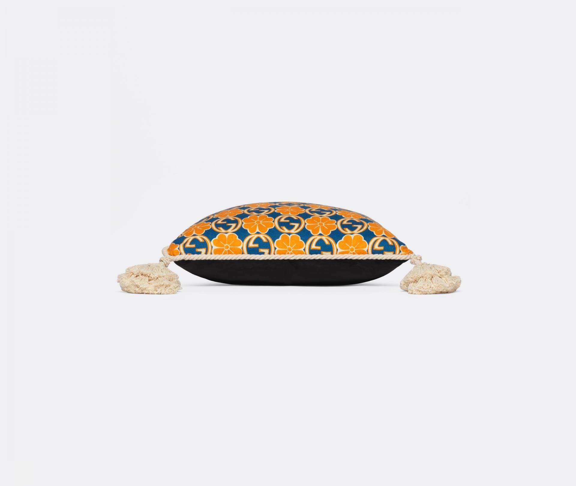 Inspired by Alessandro Michele's ready-to-wear collections for Gucci, this square cushion is covered in the brand's signature double 'G' and flowers pattern in orange and blue-coloured jacquard, while a black moire fabric can be found on the cushion's flip side. Feather filled and trimmed with knotted tassels, the cushion introduces Alessandro Michele's Gucci into interior spaces, courtesy of the new Gucci Décor collection.