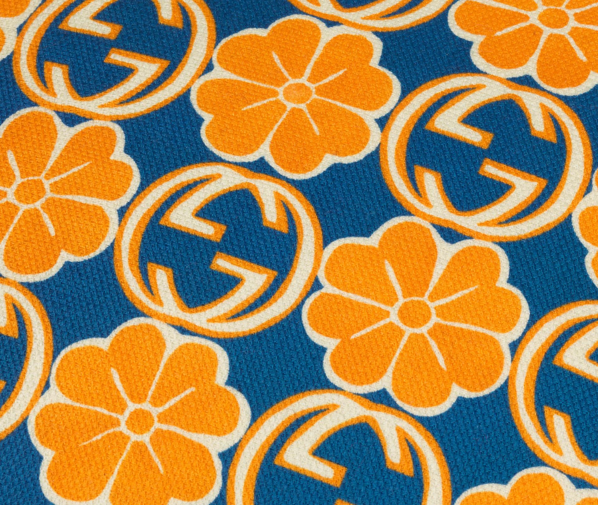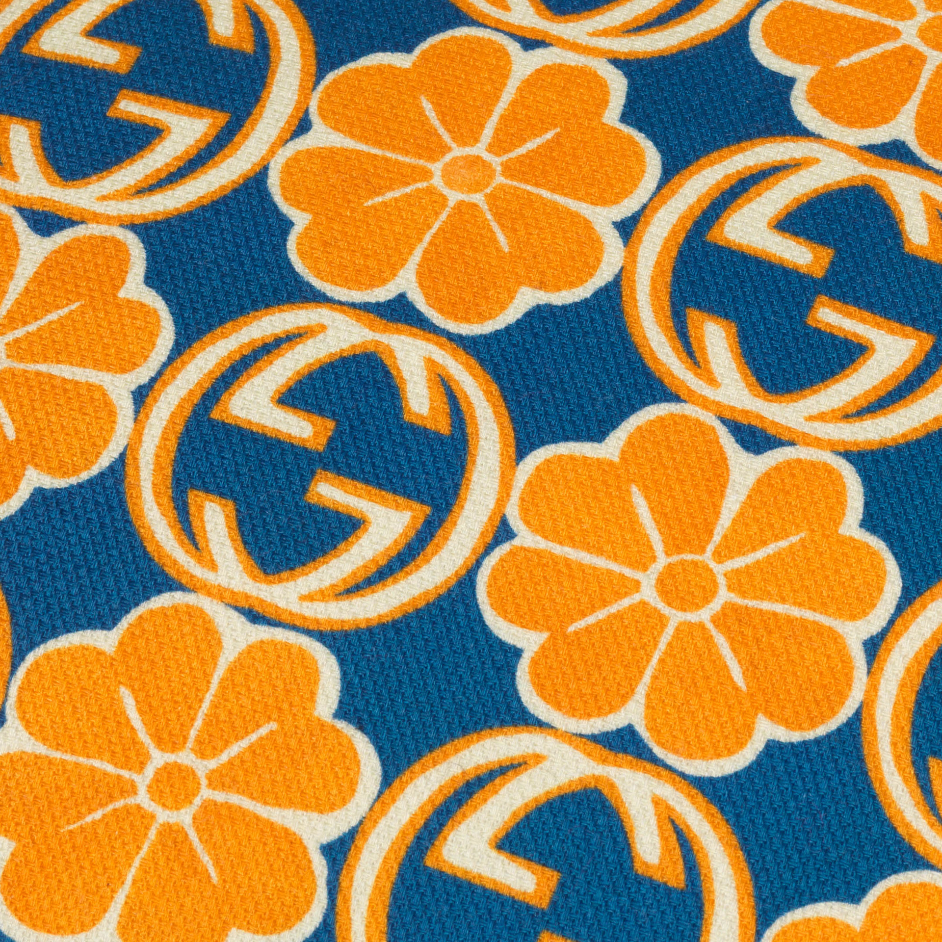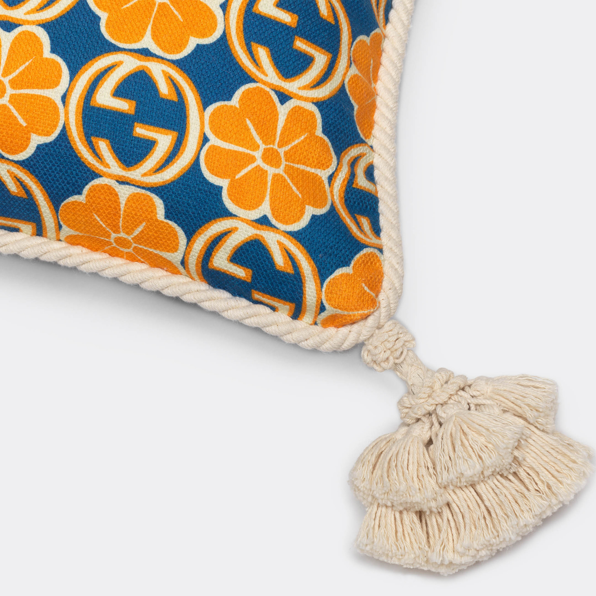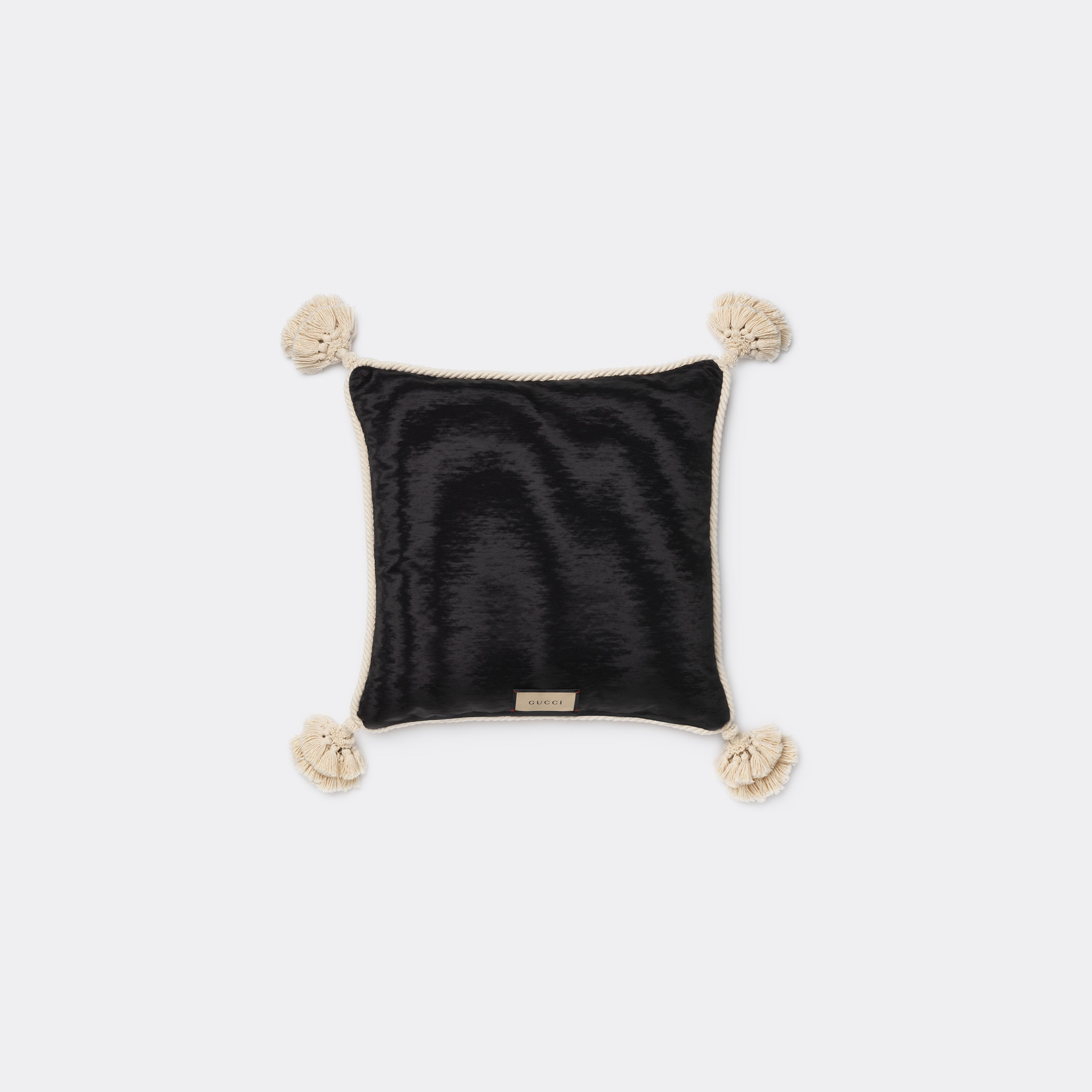 Inspired by Alessandro Michele's ready-to-wear collections for Gucci, this square cushion is covered in the brand's signature double 'G' and flowers pattern in orange and blue-coloured jacquard, while a black moire fabric can be found on the cushion's flip side. Feather filled and trimmed with knotted tassels, the cushion introduces Alessandro Michele's Gucci into interior spaces, courtesy of the new Gucci Décor collection.